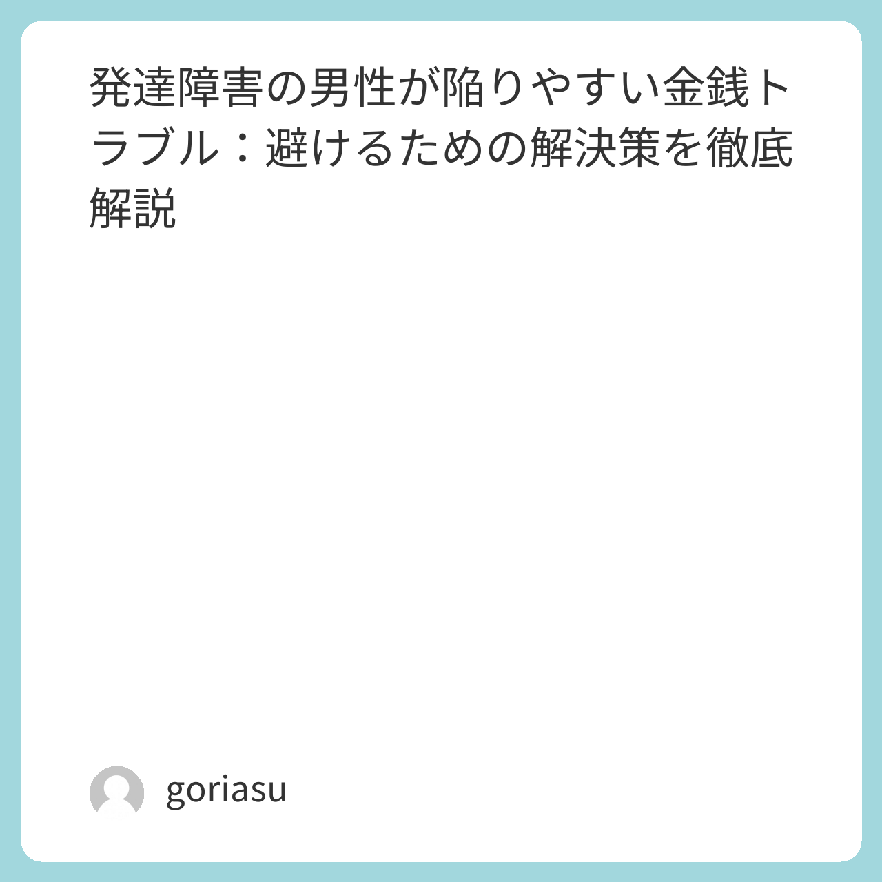 発達障害を持つ男性にとって、金銭管理は難しい課題ですが、少しずつ対策を講じることでトラブルを避けることができます。僕自身も、自分に合った方法を見つけることで、金銭トラブルを減らすことができました。大切なのは、一人で抱え込まずに、サポートを求めること。外部の力を借りながら、計画的な金銭管理を実践していきましょう。
