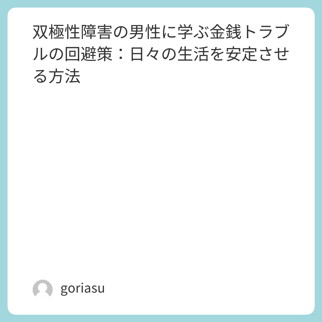 双極性障害を持つ男性にとって、金銭トラブルは生活の安定に大きく影響する課題です。躁状態では過度な浪費、うつ状態では経済的な意思決定が困難になることもあり、これらの不安定さが原因で金銭的な問題が起きやすくなります。この記事では、金銭トラブルを回避し、日々の生活を安定させる方法について考えてみます。